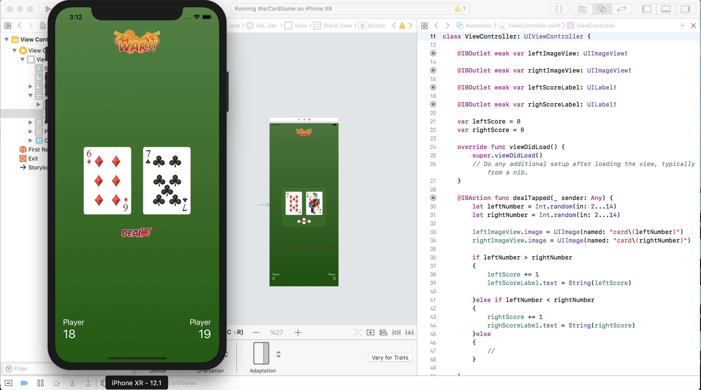 - A “PLAY AGAIN” button is displayed that resets and displays all scores to 0 again and re-enables the Deal button.