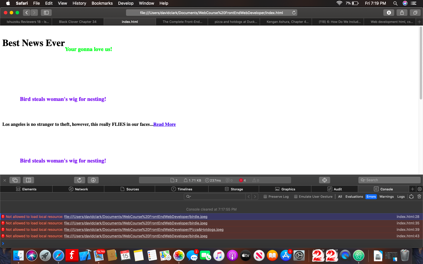 Just curious about any web developers here. I have a problem with my img src= “” /. I have the photo I want to use “birdie.jpeg” and when I refresh the page it doesn’t load.